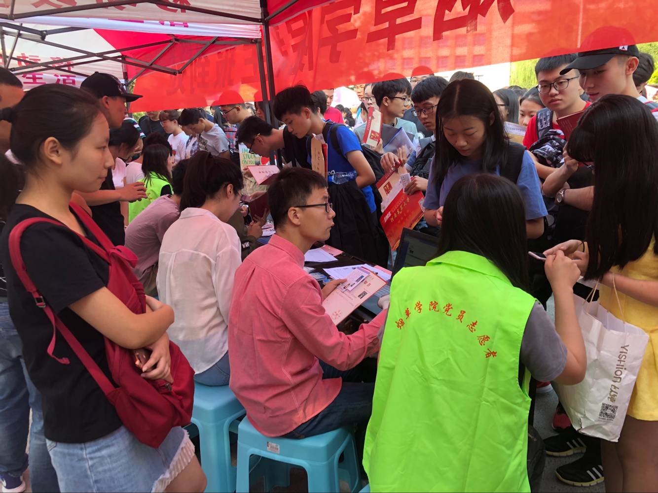 9月11日,h图书馆 迎新工作拉开帷幕,为积极发挥基层党组织战斗堡垒作用及党员的模范带头作用,亮出党员身份,h图书馆 在迎新点设立“党员先锋岗”。