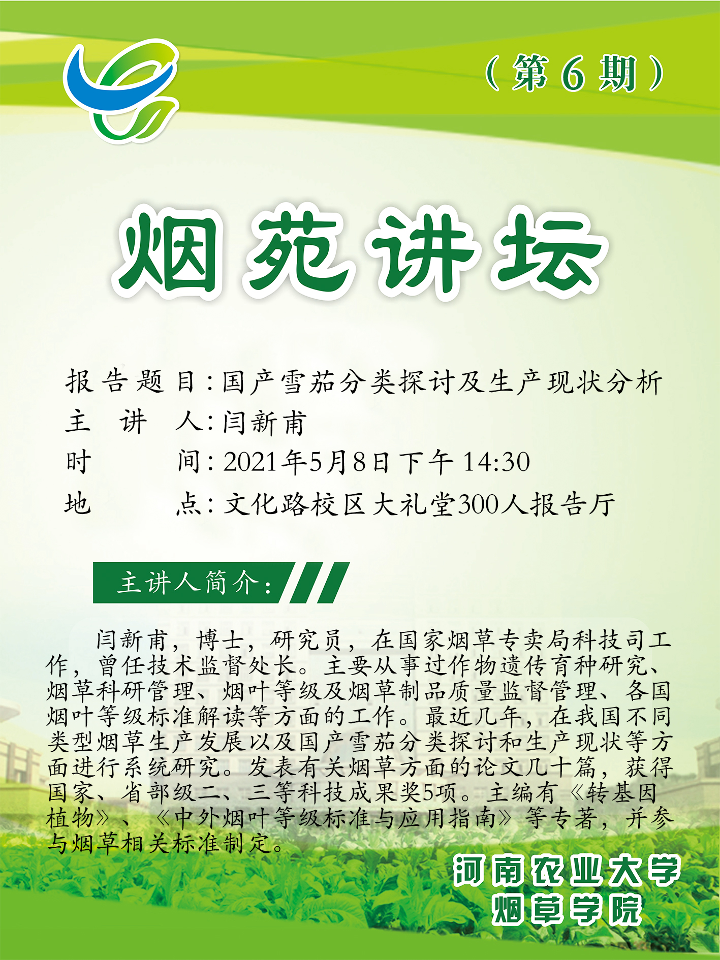 闫新甫,博士,研究员,在国家烟草专卖局科技司工作,曾任技术监督处长。主要从事过作物遗传育种研究、烟草科研管理、烟叶等级及烟草制品质量监督管理、各国烟叶等级标准解读等方面的工作。最近几年,在我国不同类型烟草生产发展以及国产雪茄分类探讨和生产现状等方面进行系统研究。发表有关烟草方面的论文几十篇,获得国家、省部级二、三等科技成果奖5项。主编有《转基因植物》、《中外烟叶等级标准与应用指南》等专著,并参与烟草相关标准制定。