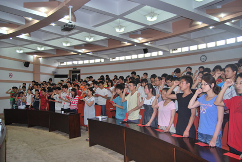 大会在雄壮的国际歌声中拉开了帷幕。许自成同志首先宣读了新党员名单,面对着火红的党旗,在院团委副书记李丹同志带领下,全体新党员庄重地宣读了入党誓词。