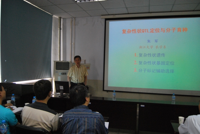 访问,为作物学科青年教师和研究生同学作了题为“复杂性状基因定位与分子育种”学术报告。朱军教授从孟德尔性状、复杂性状等两类不同性状的遗传机理入手,介绍了数量性状分析与分子育种的关系;从基因效应大小到分子标记连锁图谱构建、不同特性遗传群体构成,概述了数量性状基因定位的新方法;通过遗传分析全模型及其矩阵表达式的讲解,介绍了统计遗传计算机软件的研发、应用和输出结果的解释;特别以油菜籽油分含量为例,介绍了QTL净遗传效应、特定t时刻的条件遗传效应的基因调控,强调了检测及删除QTL定位异常数据的方法及多目标性状同步改良的意义。此外,还介绍了近年来关于QTL领域的研究成果在分子育种中的应用,建议基于网络资源进行基因信息挖掘。最后,朱军教授还以大量图片展示了浙江大学紫荆港新校区面貌,勉励青年学子到浙大深造。