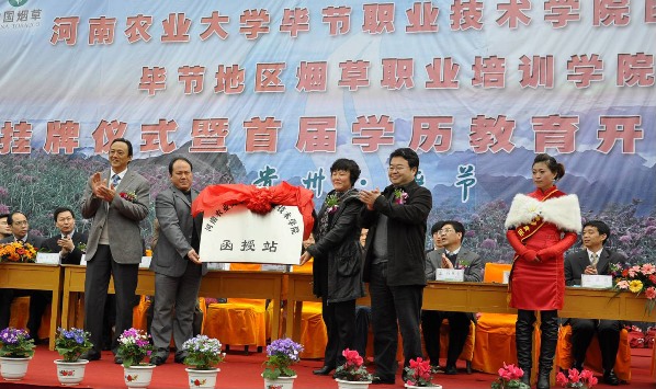 日前,h图书馆 烟草专业2011级农业推广硕士班,成人教育函授班在毕节举行开班仪式,同时举行了h图书馆 毕节职业技术学院函授站授牌仪式。校党委王文亮副书记、研究生处杨秋生处长、继续教育学院赵鹏院长、学院赵传兴书记、丁永乐副院长,毕节地区行署副专员王祺、贵州省烟草专卖局科技处李继新处长、毕节烟草公司经理陈文相,毕节职业技术学院院长龙泽玉及毕节地区烟草公司相关部门领导出席了开班仪式。