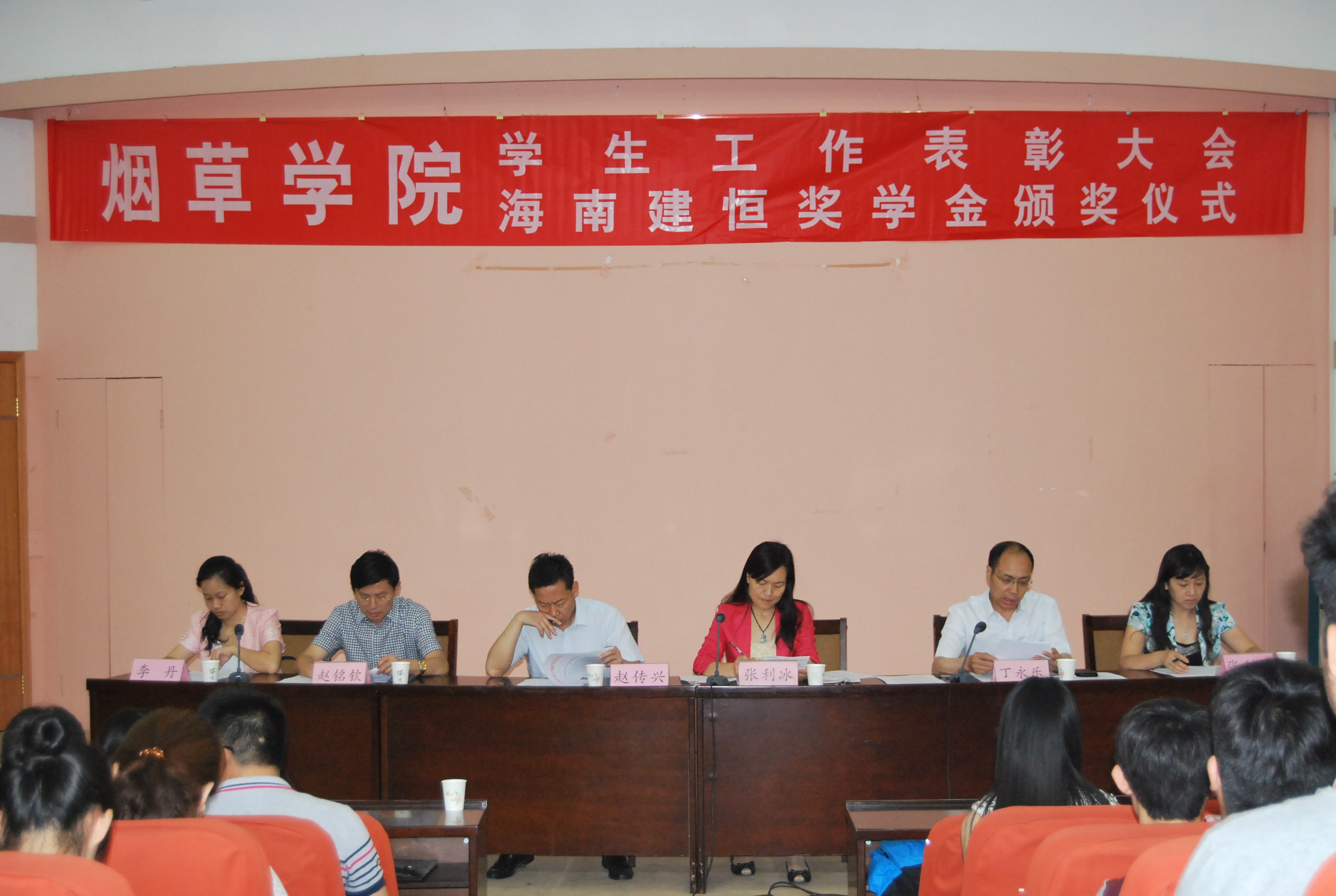 学生工作表彰大会暨海南建恒奖学金颁发仪式在礼堂300人报告厅举行。院党委书记赵传兴、副书记张利冰,副院长赵铭钦、丁永乐,办公室主任张利军出席会议,h图书馆