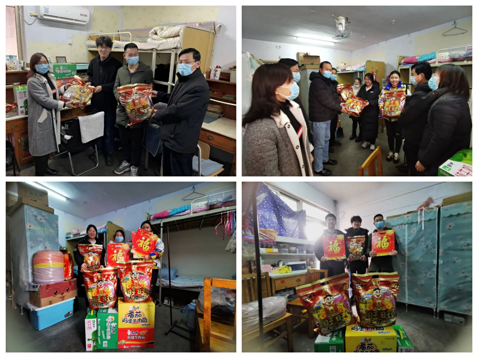 学院领导到学生宿舍和实验室,询问了同学们的学习状态、实验进展、生活方便度等情况,为他们送上新春祝福、发放慰问礼包,嘱咐大家一是要严格遵守学校疫情防控规定,非必要不出校,有事出校门要履行请销假手续;二是调整好心态,积极学习,用留校时间充实自己;三是假期期间自觉做好实验室和宿舍安全防范;四是学校学院尽力保障好大家的学习生活条件,有困难和需求及时与老师联系,及时向家长保平安,大家同舟共济、砥砺奋进,过个安全、充实、祥和的虎年。留校学生对学院的关心和鼓励表示感谢,大家纷纷表示,一定不辜负老师们的期望,认真学习,努力实现自己的梦想。另外,研究生导师采用不同方式和同学们一起过“小年”,为学生送上了温馨的祝福。