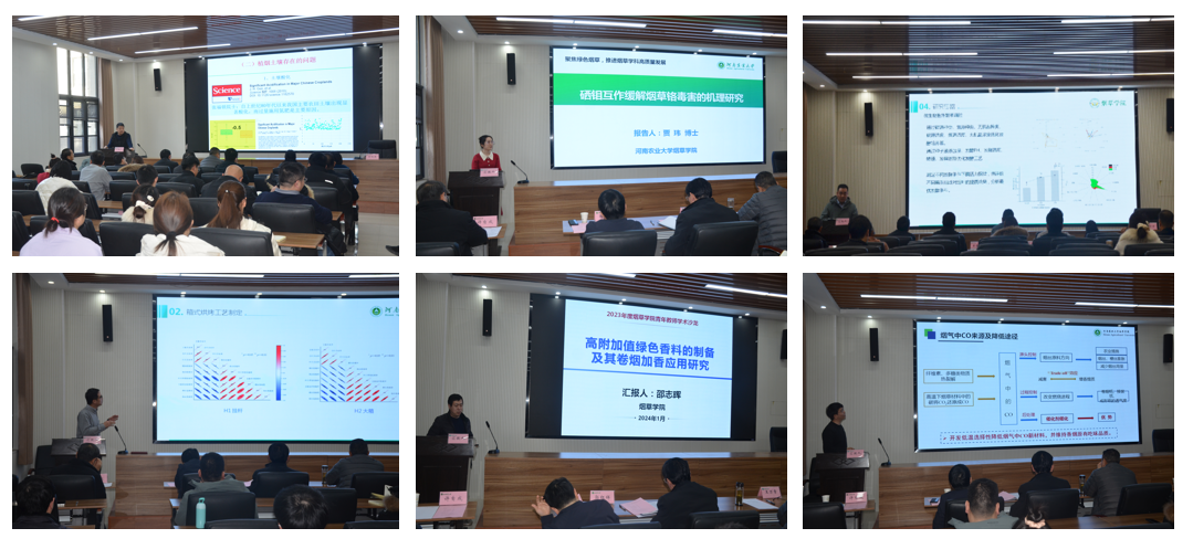 青年教师叶协峰、贾玮、付博、遆晋松、邵志晖、崔冰分别以“植烟土壤中一些问题的探讨”、“硒钼互作缓解铬毒害的机理研究”、“基于生物发酵提升烟草原料品质的技术研究”、“箱式烟叶烘烤技术体系优化研究”、“高附加值绿色香料的制备及其卷烟加香应用研究”、“纳米材料在卷烟中的研究与应用”为题分享了各自科学研究进展。
