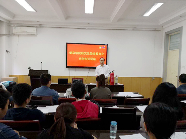 丁永乐副院长从人身安全、财产安全、交通安全、防火、防盗、意识形态安全等方面对学生进行了安全知识教育,并结合生活实例,列举了近年来典型的校园安全事件,由此引出研究生常见的安全问题,教育新生增强安全意识,强调预防为主、消防结合是做好消防安全工作的关键。丁副院长还对同学们提出了四点要求:一是要有检查火灾隐患能力;二是要有扑救初起火灾的能力;三要牢记遇到火灾的注意事项;四要牢记疏散逃生方法原则。接着,他又向同学们介绍了灭火器的正确使用方法,并发放了消防安全工作宣传资料。