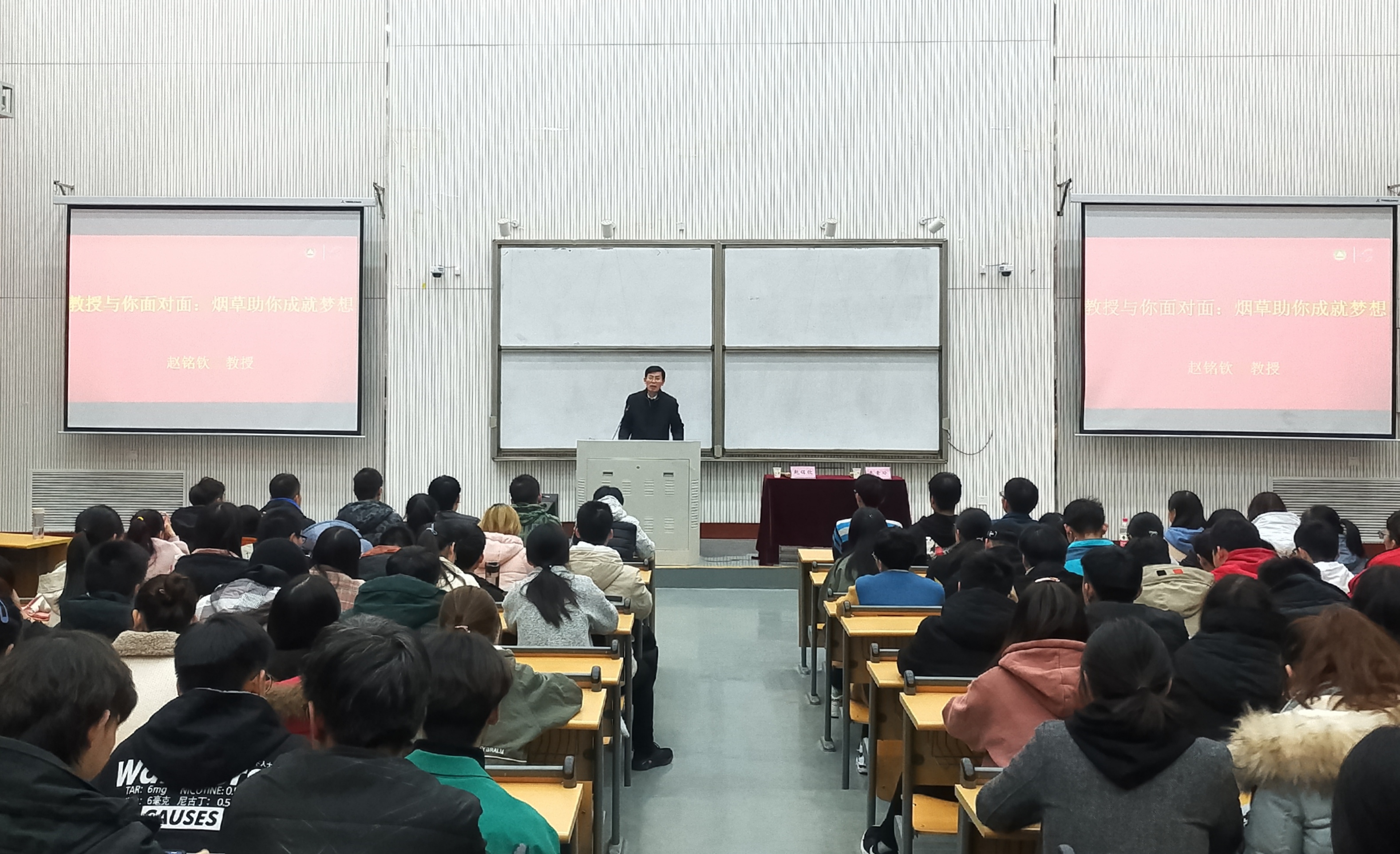 为帮助学生更好的学习烟草专业知识,了解自己的专业就业前景,11月10日晚,h图书馆 于繁塔楼大教室五举行以“烟草成就梦想”为主题的专题报告会。院长赵铭钦教授主讲,院党委副书记秦素玲主持,19级辅导员张凯、青年教师代表孙聚涛老师、19级全体学生参加此次报告会。