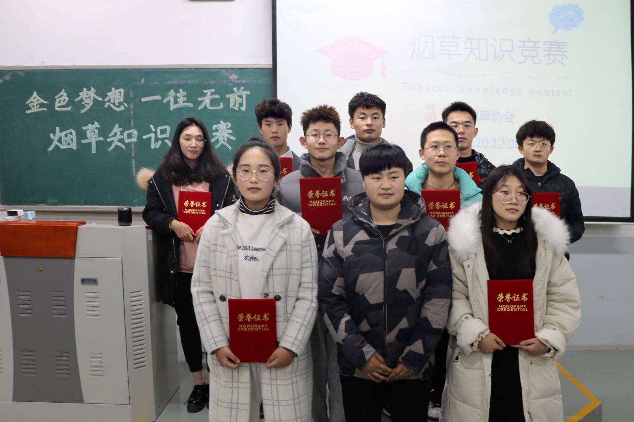 于繁塔楼C座202教室举办以“金色梦想,一往无前”为主题的烟草知识竞赛。此次活动由推免生陈祖销、校学生会主席团成员赵颐翔、院学生会成员赵世新、韩鑫、张有奇、范普晴担任评委,董千锋、白朝阳主持,20级各班代表参加。