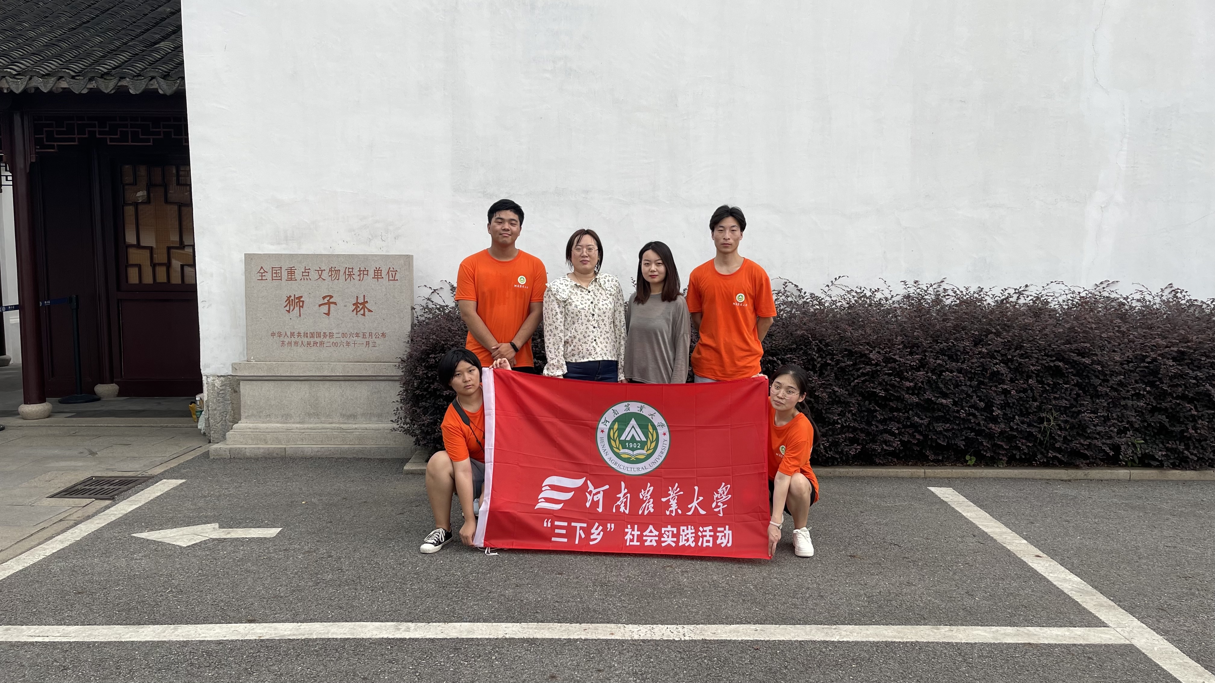 根据前期资料搜集结果,小分队前往苏州狮子林进行探访,重温学校传薪兴学的历史和责任,深度挖掘“明德自强,求是力行”的校训含义和“弘农爱国,厚德质朴,求真创新,包容奋进”的农大精神。在苏州狮子林园内,穿过云林逸韵、九狮峰、卧云室等具有历史气息的园林景观,推开园区后门呈现眼前的是一栋民国建筑,红窗灰墙,这是狮子林综合服务办公楼。经与狮子林服务中心办公室副主任沈峰交流沟通,沈主任协助查阅了《狮子林志》和与本单位一位年过七旬的退休老先生电话沟通后推断,如今的这栋办公楼应为1948年河南大学农学院学子学习和生活的旧址。门楣上书“读书便佳”的箴言如刀刻斧凿般印在队员们心间。队员们从中感受到了老一辈农大人在极为艰苦的条件下,不屈不挠、艰苦奋斗、勤俭建校的精神。这栋楼红楼曾经支撑起农大学子的理想与信念,今后也将继续激励农大学子坚守初心、砥砺奋进。