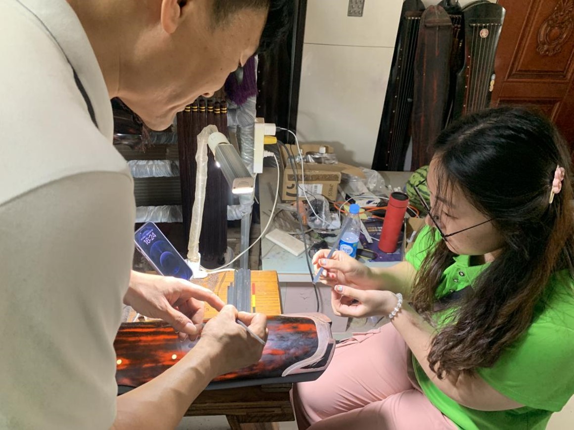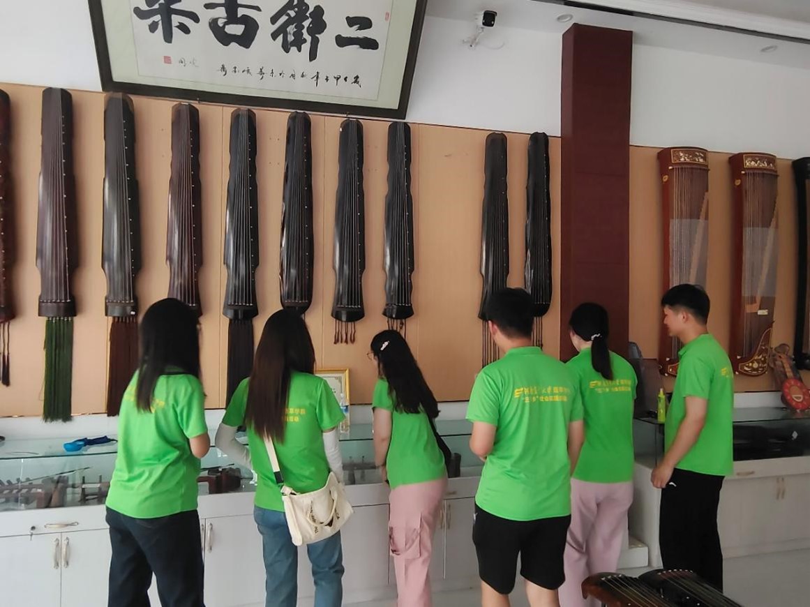 追随着民乐声,实践团来到兰考县堌阳音乐小镇,在民族乐器工业园中参观了造型、雕花各异的古筝、琵琶等民族乐器;并在袁玉则师傅的带领下,来到桐韵乐器公司观摩学习古筝的制作与弹奏方法;随后实践团前往民族乐器示范村——徐场村,同二卫琴坊的张望师傅学习古琴的雕刻、制作。