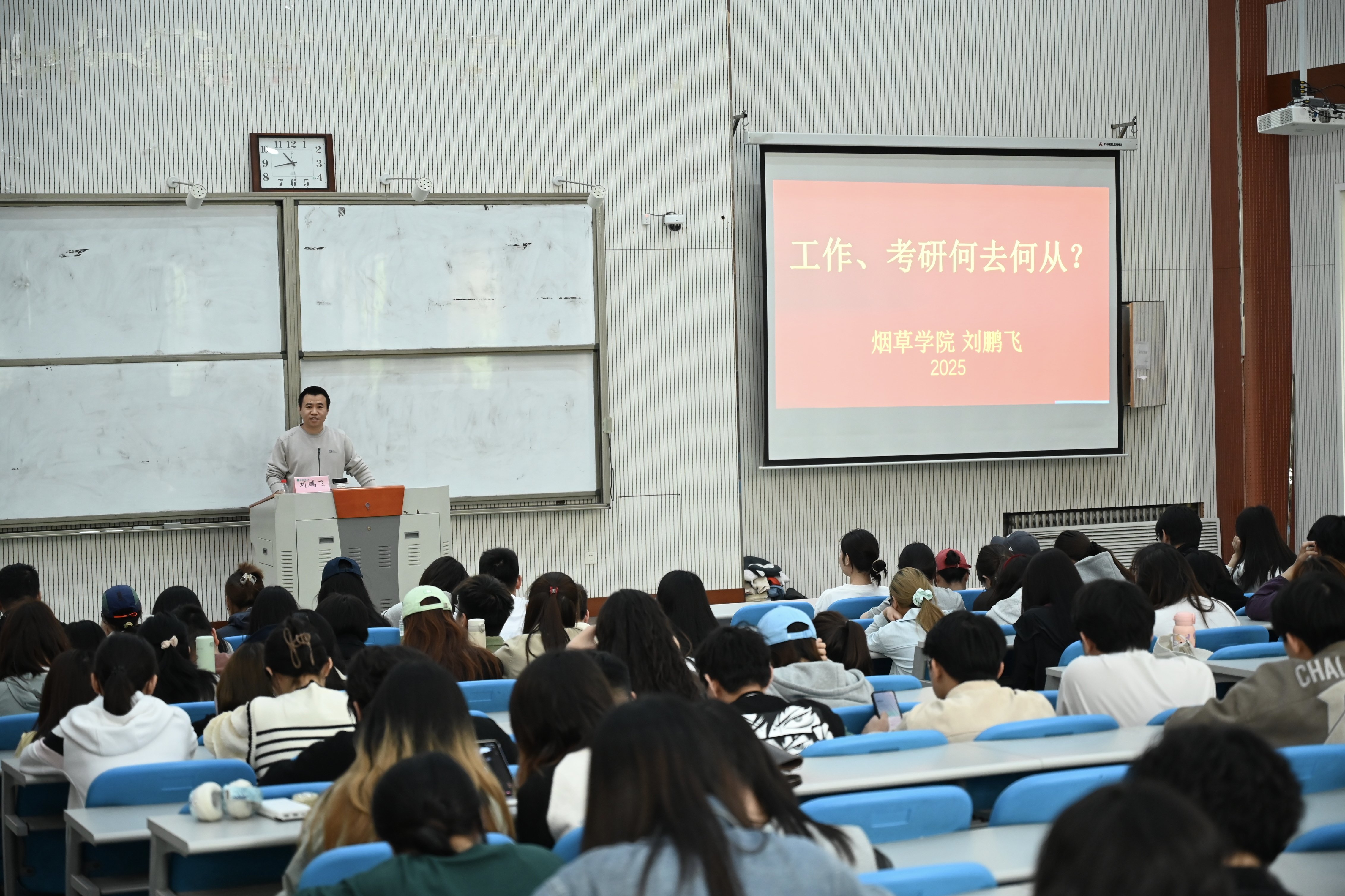 会上,刘鹏飞结合烟草行业现状及学院历年来升学就业趋势,分别从职业生涯规划、就业方向指导和考研备考策略等三个方面进行了具体详细的讲解。他脉络清晰地梳理了烟草行业中工业、商业的岗位类别和性质差异,为学生进行人职匹配和报考准备打下基础。此外,刘鹏飞精准分析了近年来考研报考趋势,悉数罗列烟草及相关专业院校和科研院所的招生情况,倡导学生要尽早确立考研目标,理清优先次序。学生纷纷表示:刘老师的报告“干货满满”,有效化解了考研就业准备期的迷茫和焦虑。