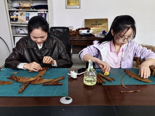 本次专项实践学习以 “聚焦核心工艺、强化技能实操” 为核心导向,紧扣雪茄烟产品设计专业培养要求,重点围绕雪茄烟卷制前处理、茄衣茄胚制作、叶组配方优化及感官质量评价等核心专业内容有序开展。为保障实践学习的专业性和实效性,培训班特别邀请了拥有近 10 年雪茄烟产品设计从业经验的刘晓霞老师担任全程指导教师。本次学习坚持理论与实操结合、讲解与演示同步的形式,针对雪茄烟制作各关键工序开展精细化教学。在茄衣回潮工序中,老师现场演示标准化操作流程,精准讲解并把控温湿度核心参数,着重强调 “回潮程度直接影响茄衣的柔韧性与燃烧性,差之毫厘则谬以千里” 的专业要点;在茄胚制作教学中,采取手把手教学模式,细致教授卷制手法、力度控制等实操技巧,对学员操作中的不规范之处逐一纠正、现场指导;针对茄衣使用全流程,从茄衣的筛选、裁剪到贴合方式等细节环节,进行了细致入微的拆解讲解。
